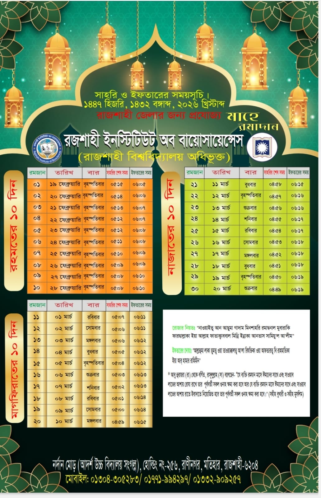 পবিত্র মাহে রমজানের সেহেরী এবং ইফতারের সময়সূচি