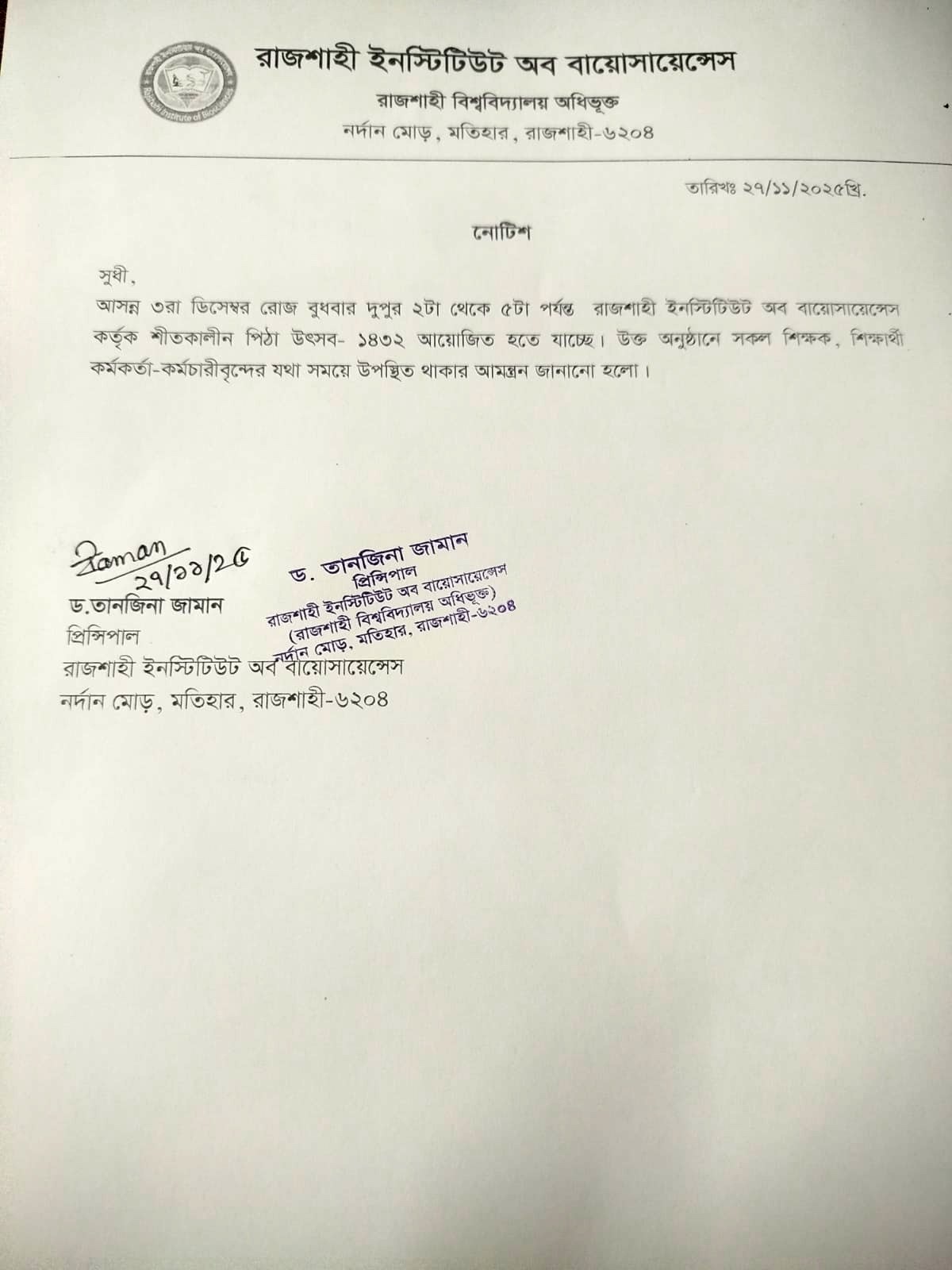 আসন্ন ৩রা ডিসেম্বর রোজ বুধবার দুপুর ২টা থেকে ৫টা পর্যন্ত রাজশাহী ইনস্টিটিউট অব বায়োসায়েন্সেস কর্তৃক শীতকালীন পিঠা উৎসব – ১৪৩২ আয়োজিত হতে যাচ্ছে।