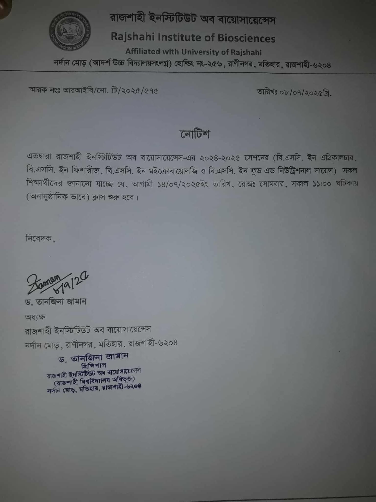 ২০২৪-২০২৫ সেশনের বি.এসসি. ইন এগ্রিকালচার, ফিশারিজ, মাইক্রোবায়োলজি ও ফুড এন্ড নিউট্রিশনাল সায়েন্স শিক্ষার্থীদের (অনানুষ্ঠানিক ভাবে) ক্লাস শুরু সংক্রান্ত বিজ্ঞপ্তি।